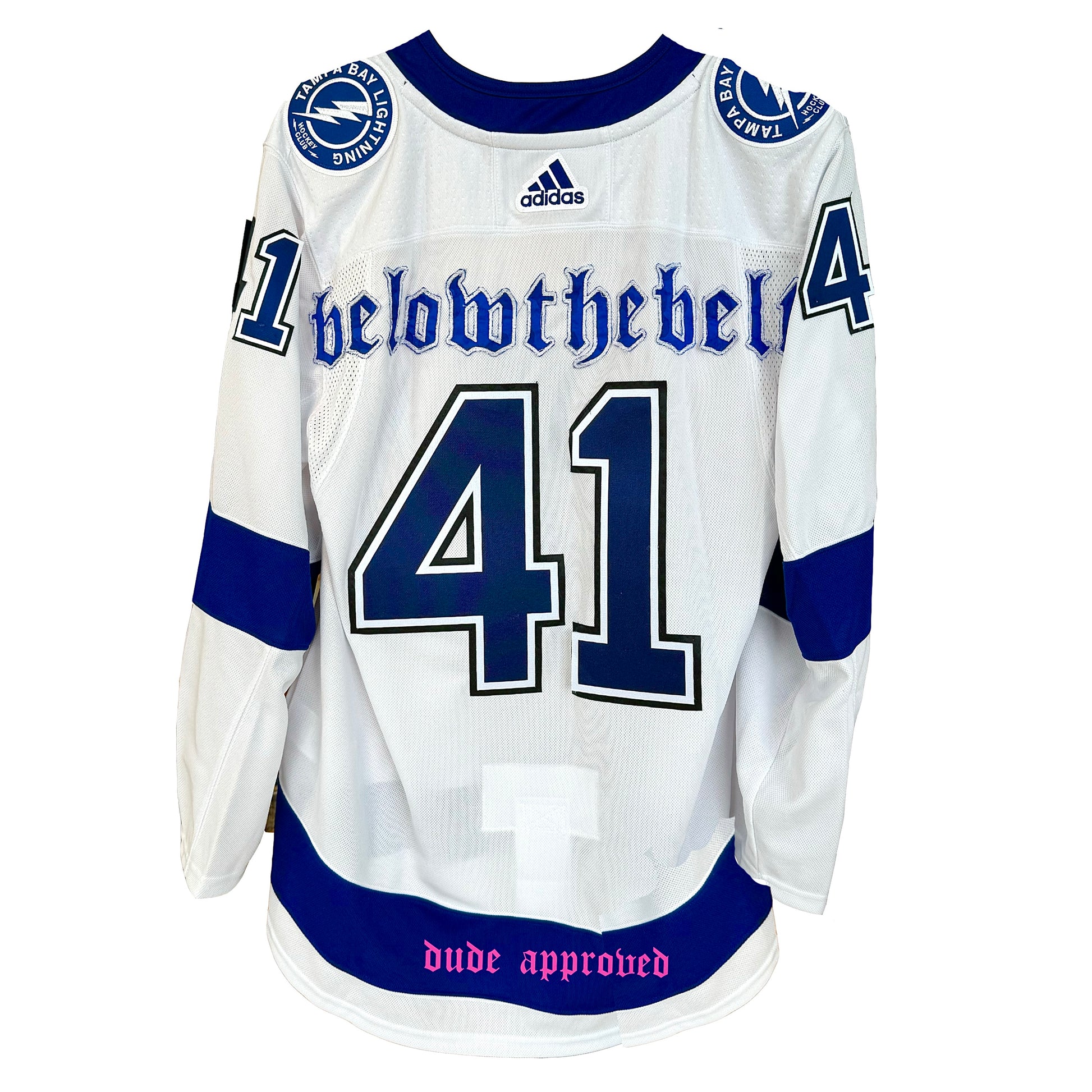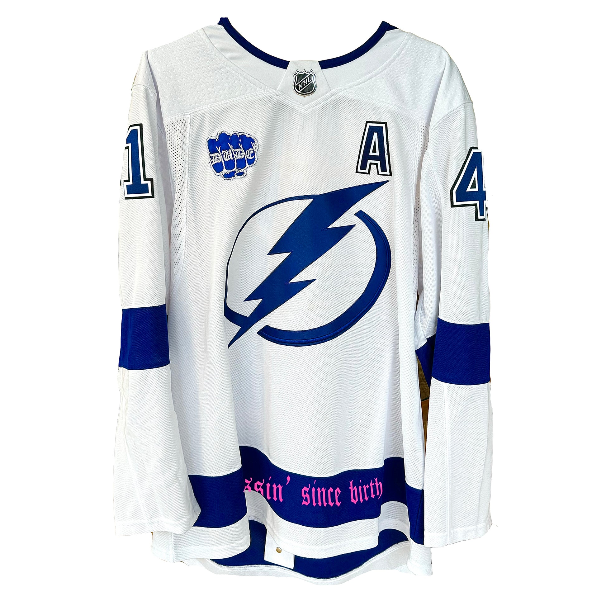 1/1 custom hockey jersey for the 41st song ‘belowthebelt’ in the 100 Week Project. Each stitch and embellishment has been carefully handcrafted and chosen to reflect the fusion of the song and the Born Dude brand. 1/1 custom hockey card and glow-in-the-dark "dude" patch included.