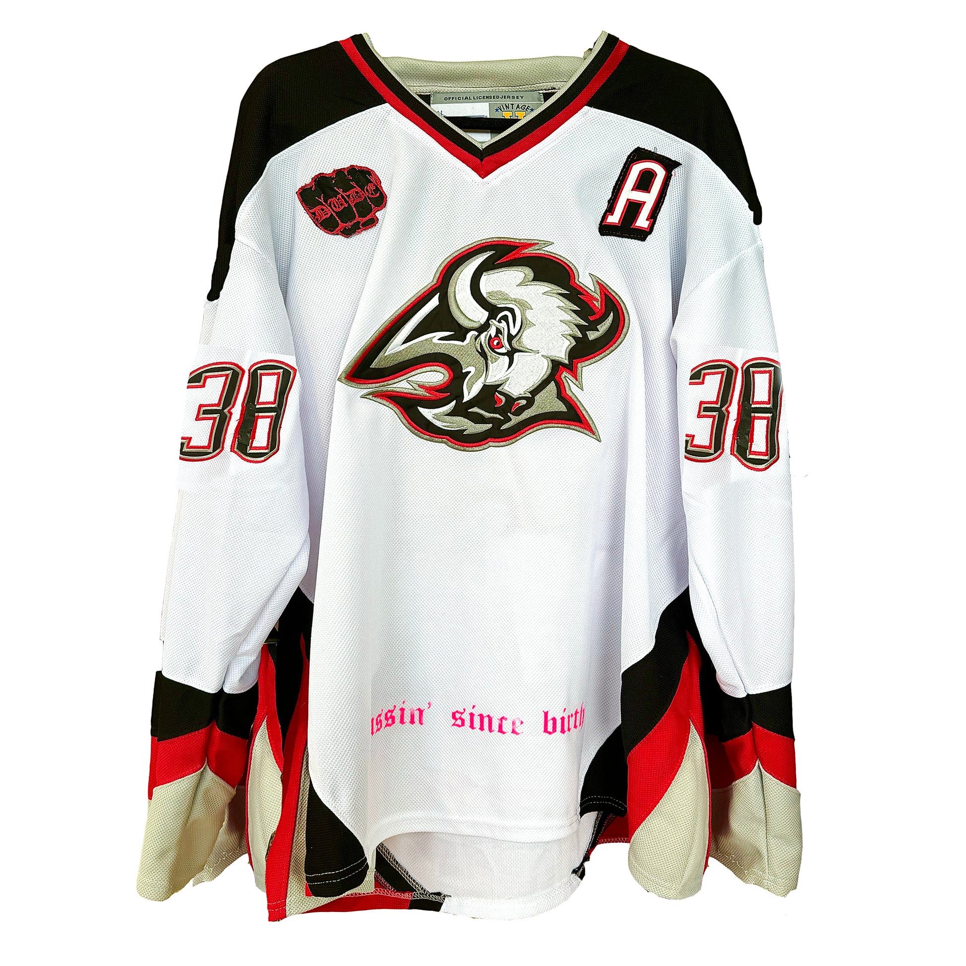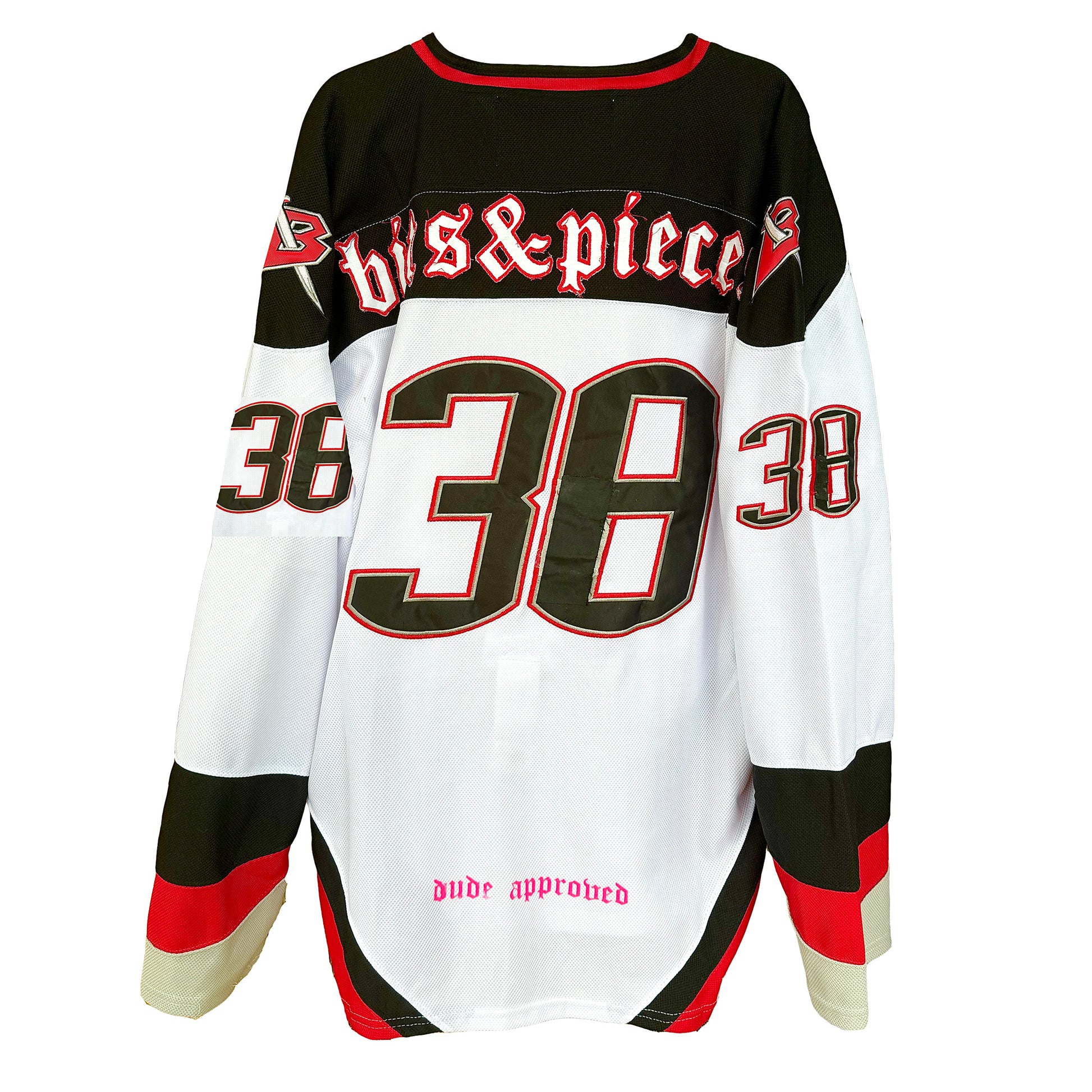 1/1 custom hockey jersey for the 38th song ‘bits&pieces’ in the 100 Week Project. Each stitch and embellishment has been carefully handcrafted and chosen to reflect the fusion of the song and the Born Dude brand. 1/1 custom hockey card and glow-in-the-dark "dude" patch included.
