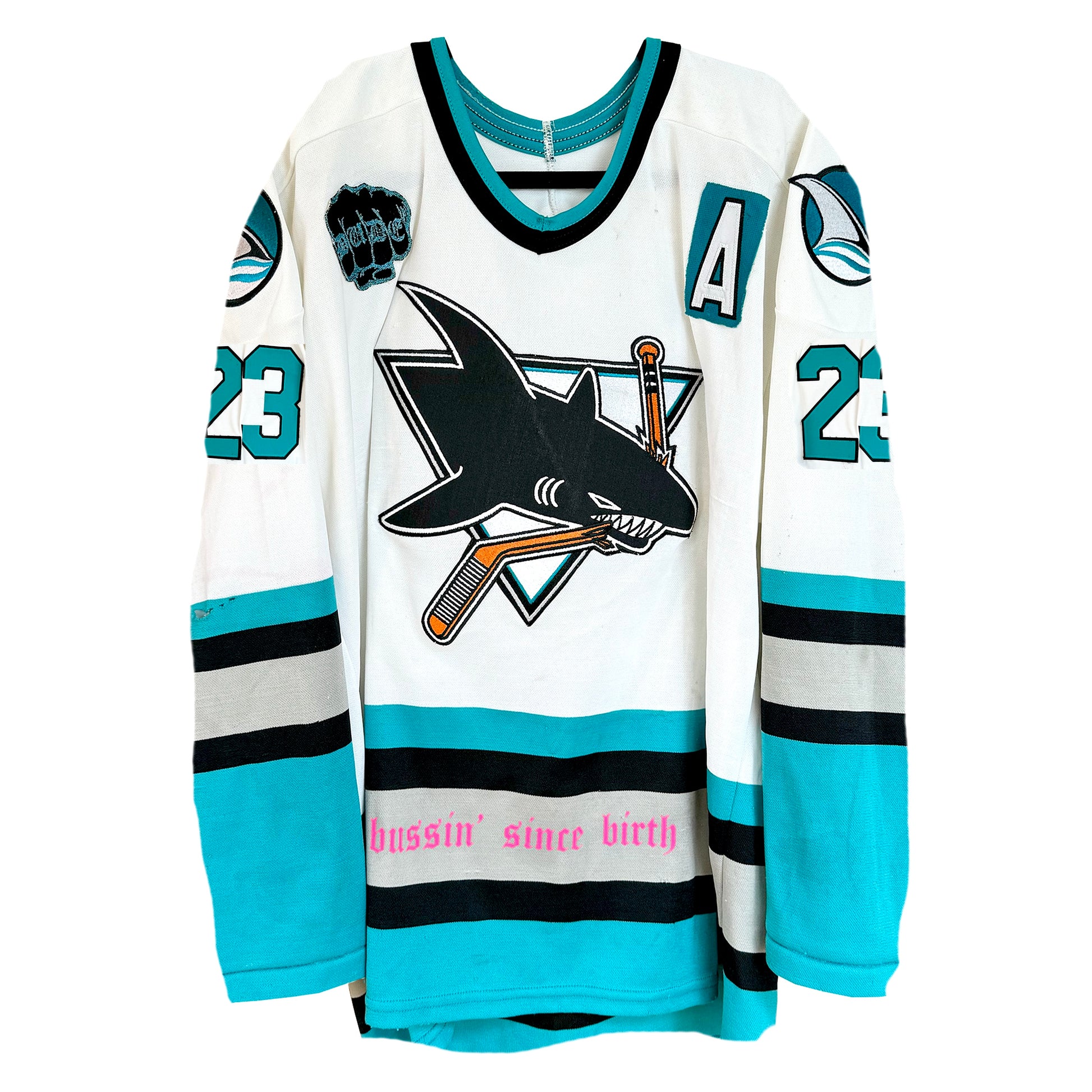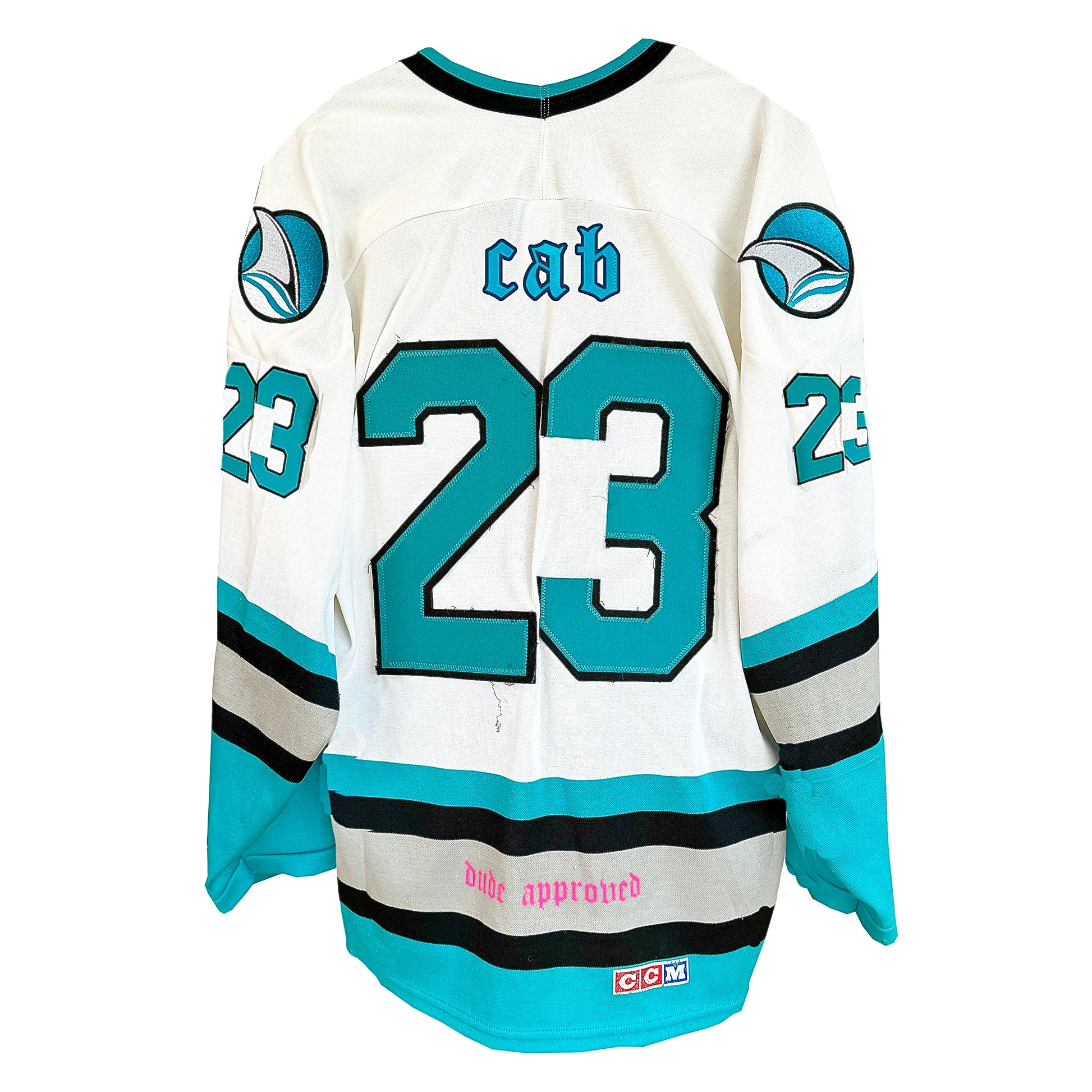 1/1 custom hockey jersey for the 23rd song ‘cab’ in the 100 Week Project. Each stitch and embellishment has been carefully handcrafted and chosen to reflect the fusion of the song and the Born Dude brand. 1/1 custom hockey card and glow-in-the-dark "dude" patch included.