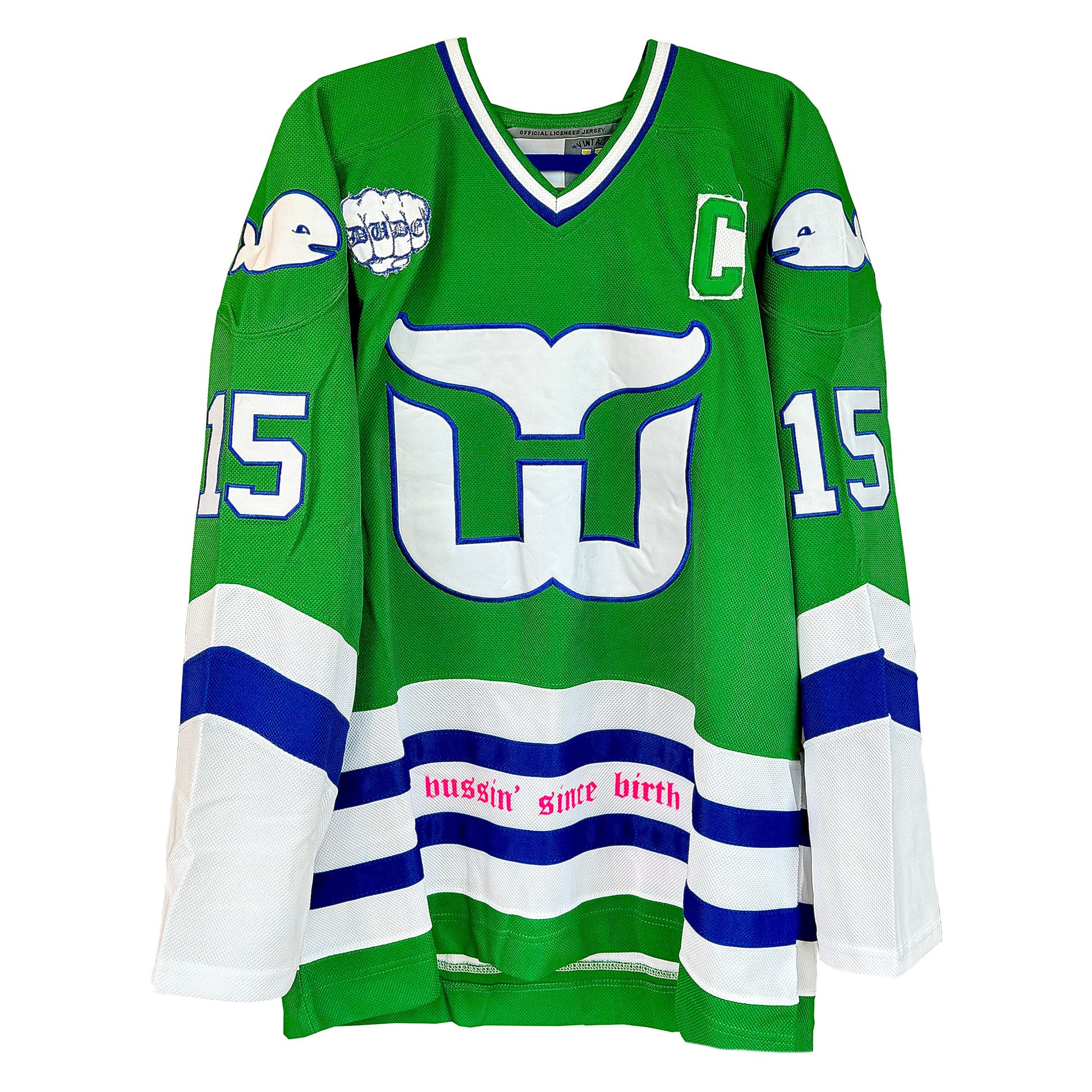 1/1 custom hockey jersey for the 15th song ‘cheapwine’ in the 100 Week Project. Each stitch and embellishment has been carefully handcrafted and chosen to reflect the fusion of the song and the Born Dude brand. 1/1 custom hockey card and glow-in-the-dark "dude" patch included.