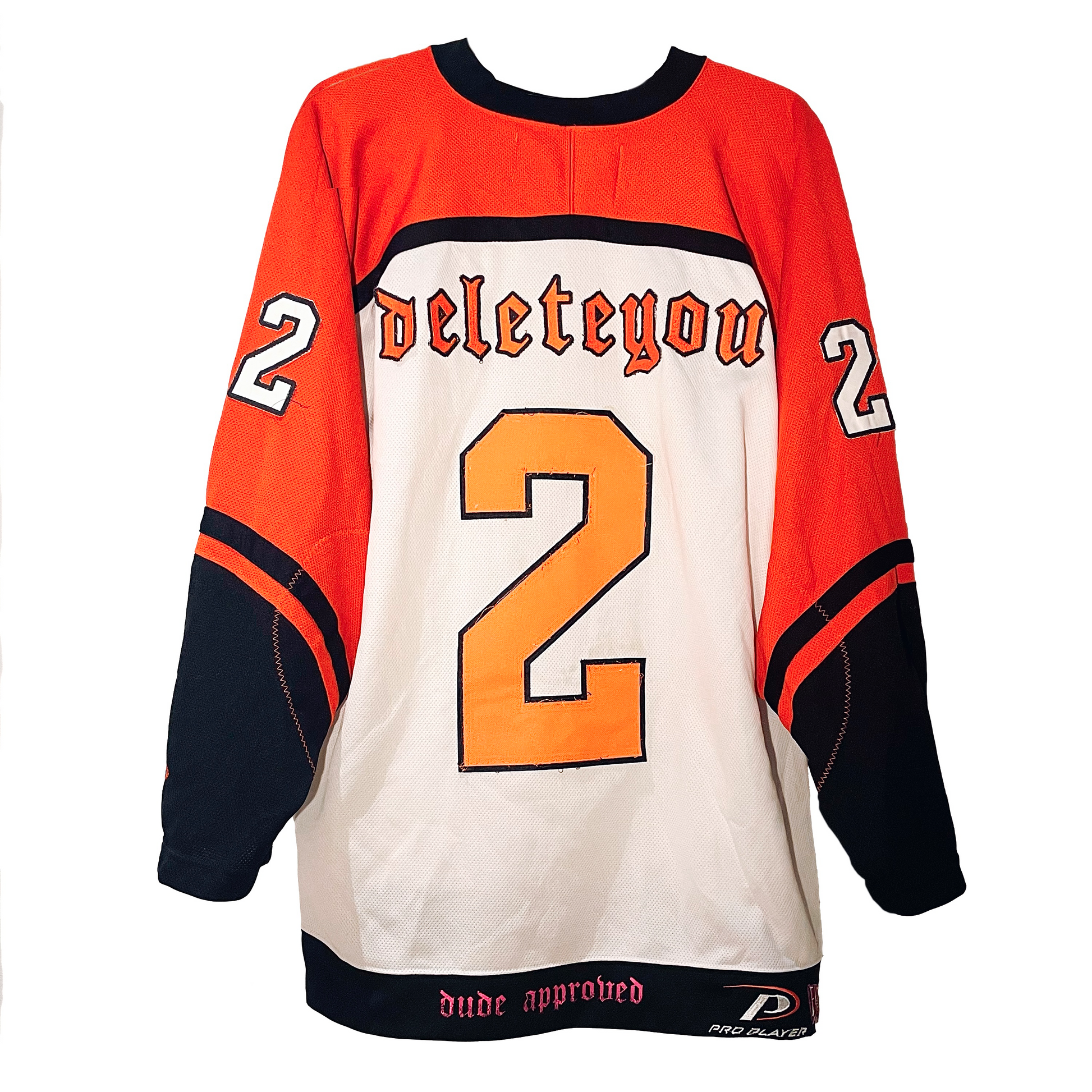 1/1 custom hockey jersey for the 2nd song ‘deleteyou’ in the 100 Week Project. Each stitch and embellishment has been carefully handcrafted and chosen to reflect the fusion of the song and the Born Dude brand. 1/1 custom hockey card and glow-in-the-dark "dude" patch included.