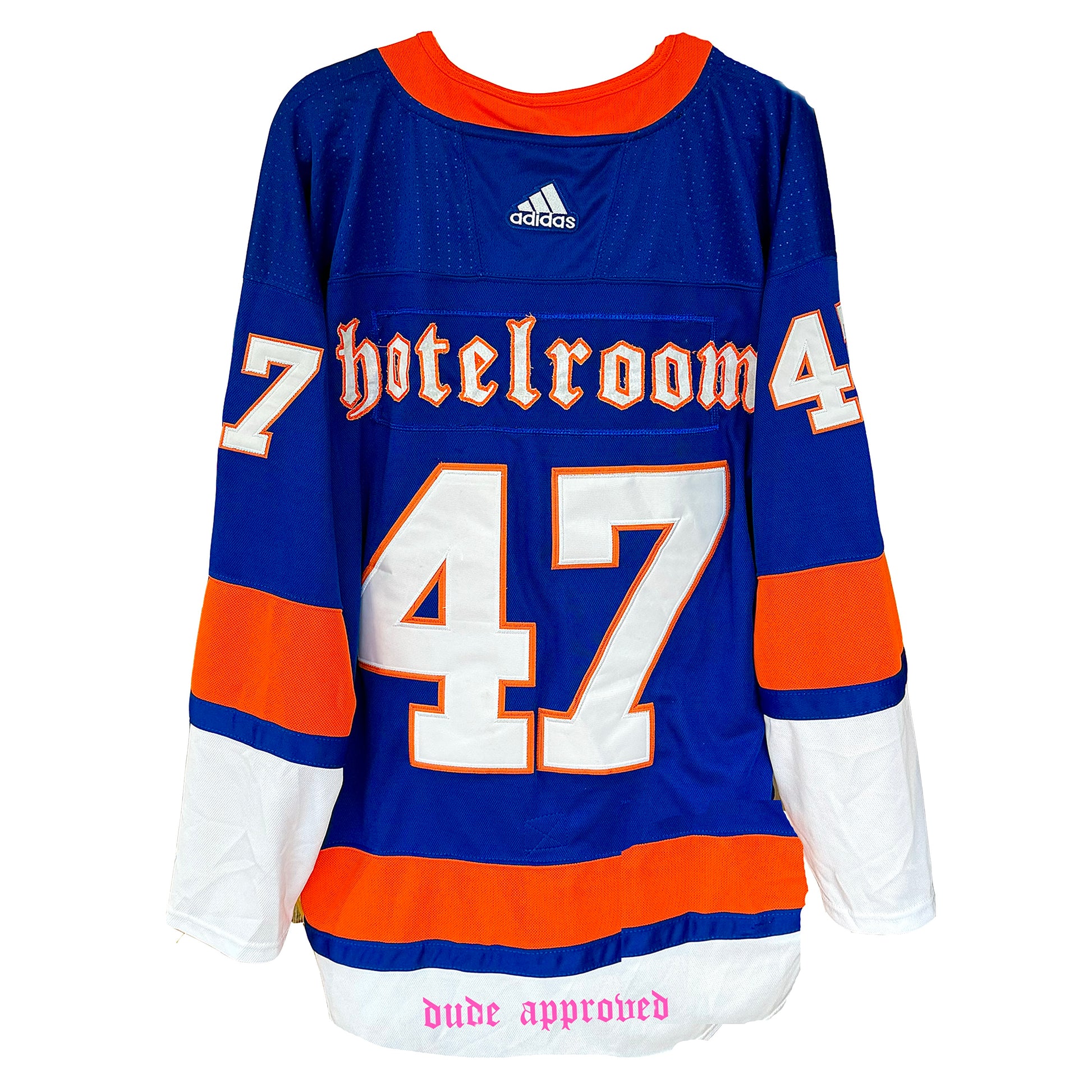 1/1 custom hockey jersey for the 47th song ‘hotelroom’ in the 100 Week Project. Each stitch and embellishment has been carefully handcrafted and chosen to reflect the fusion of the song and the Born Dude brand. 1/1 custom hockey card and glow-in-the-dark "dude" patch included.