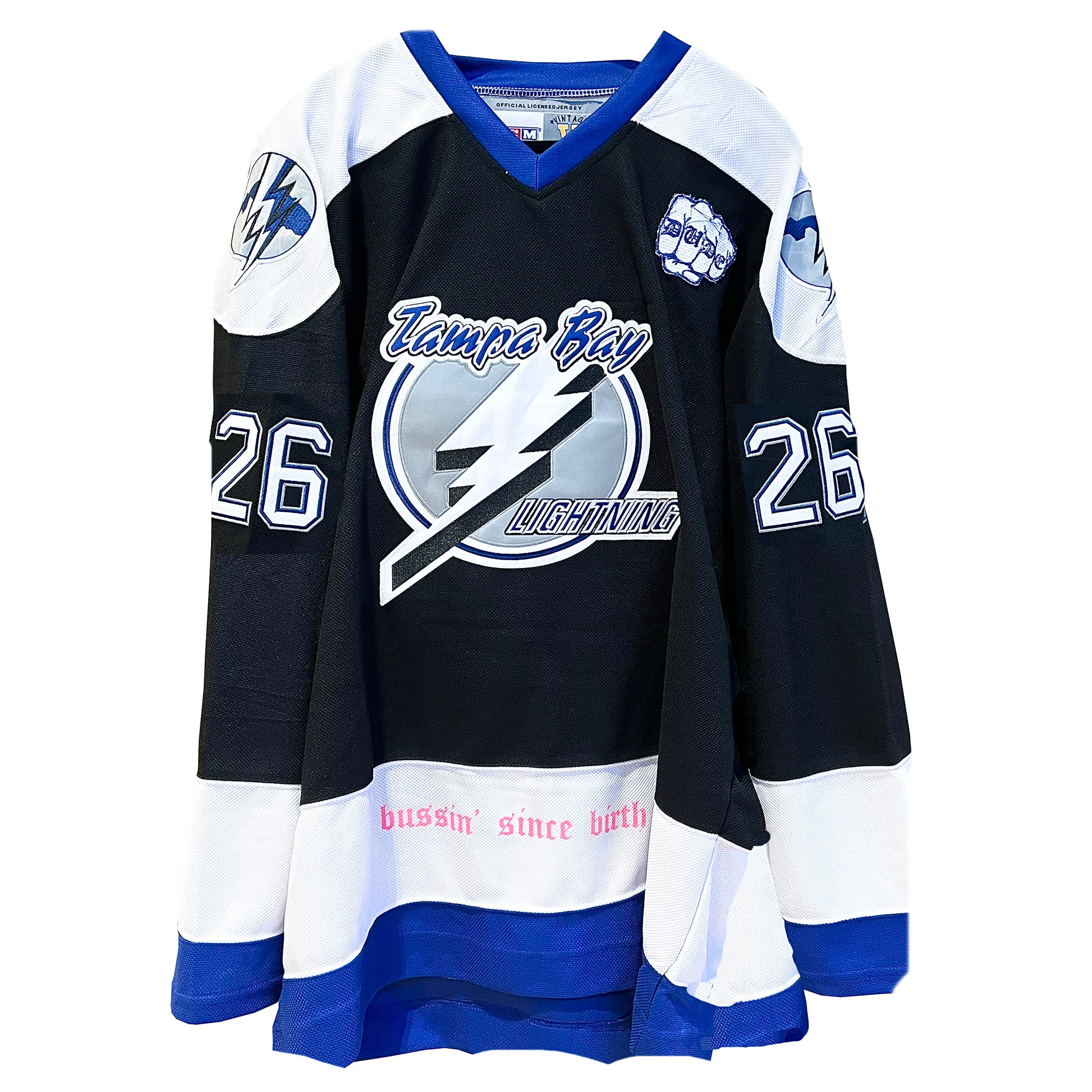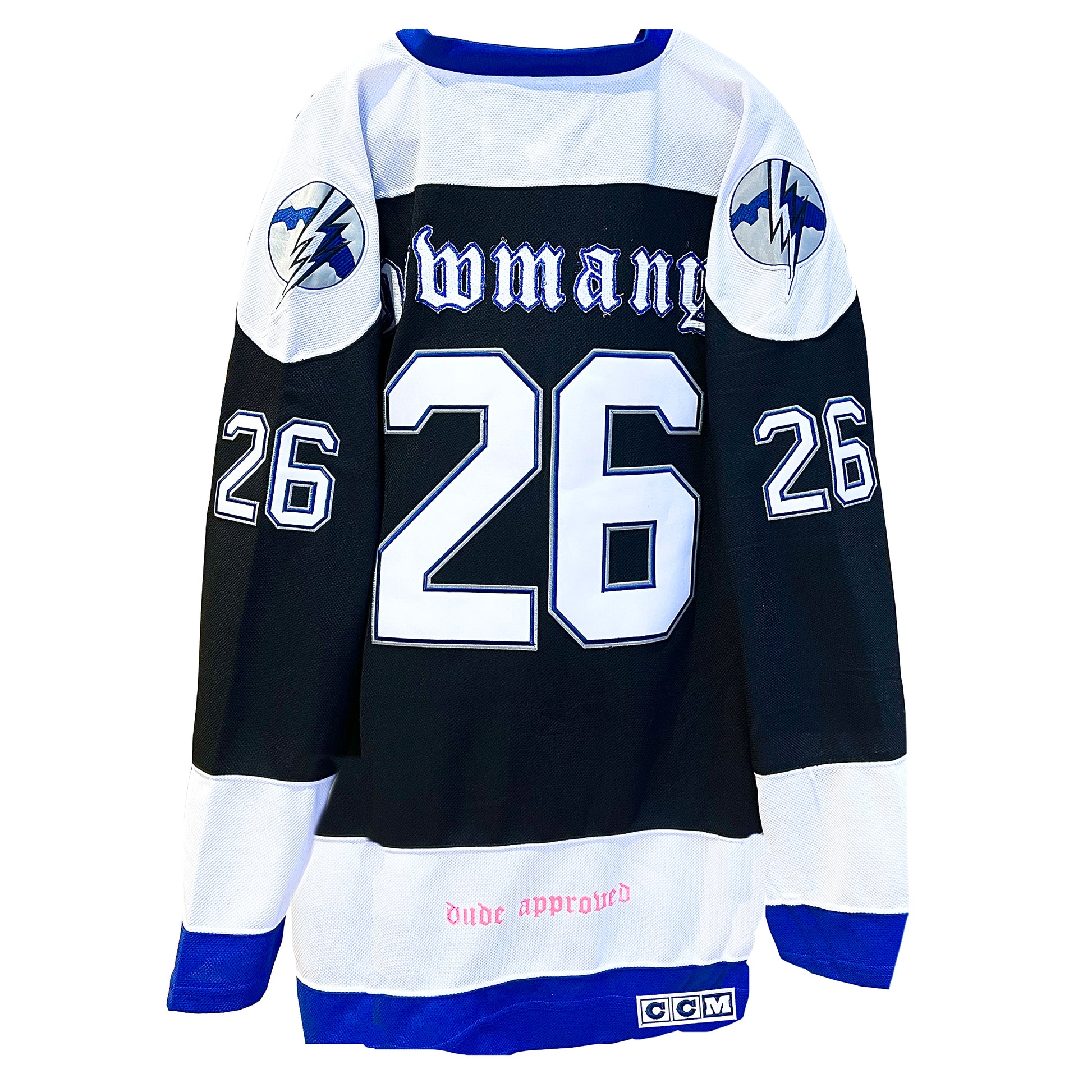 1/1 custom hockey jersey for the 26th song ‘howmany?’ in the 100 Week Project. Each stitch and embellishment has been carefully handcrafted and chosen to reflect the fusion of the song and the Born Dude brand. 1/1 custom hockey card and glow-in-the-dark "dude" patch included.