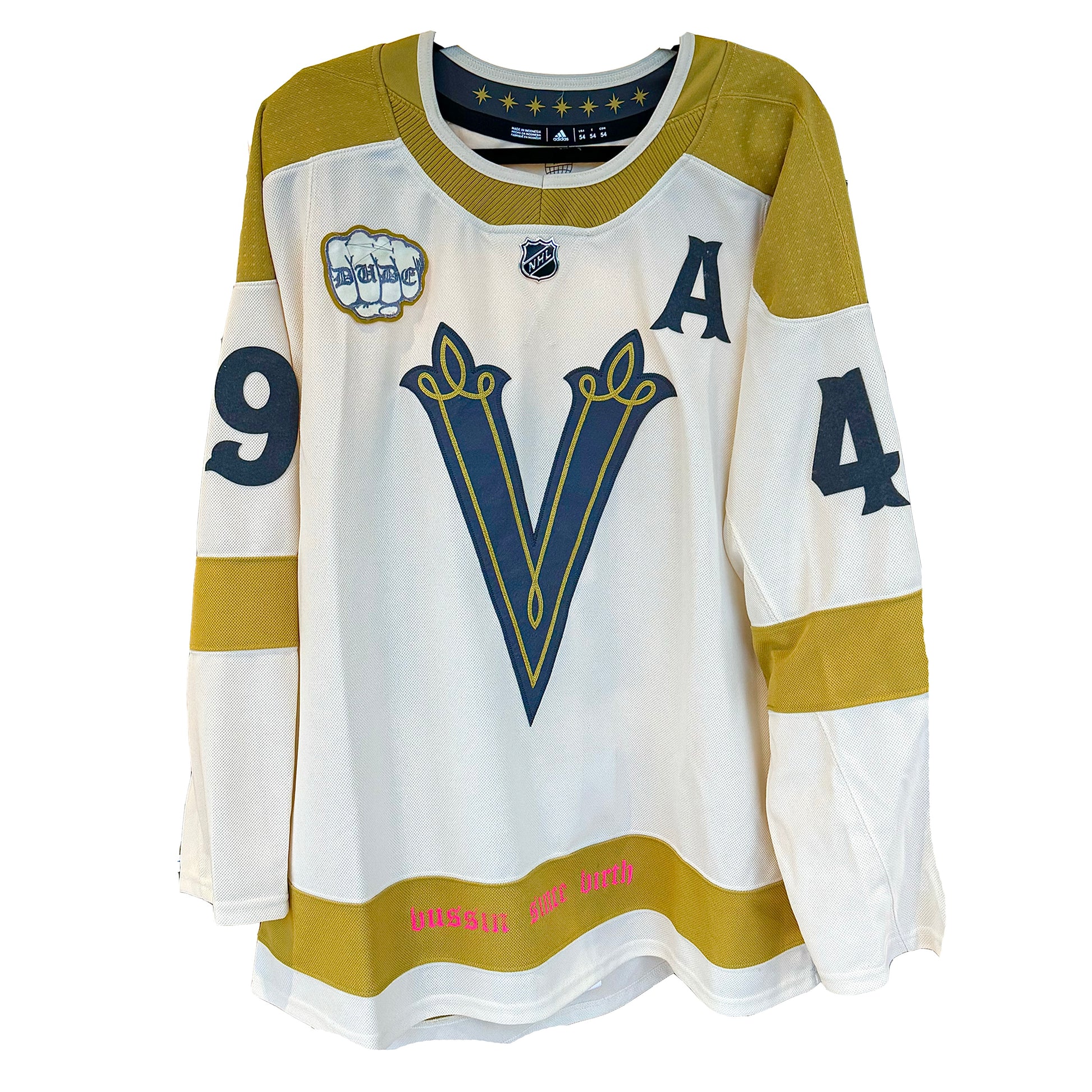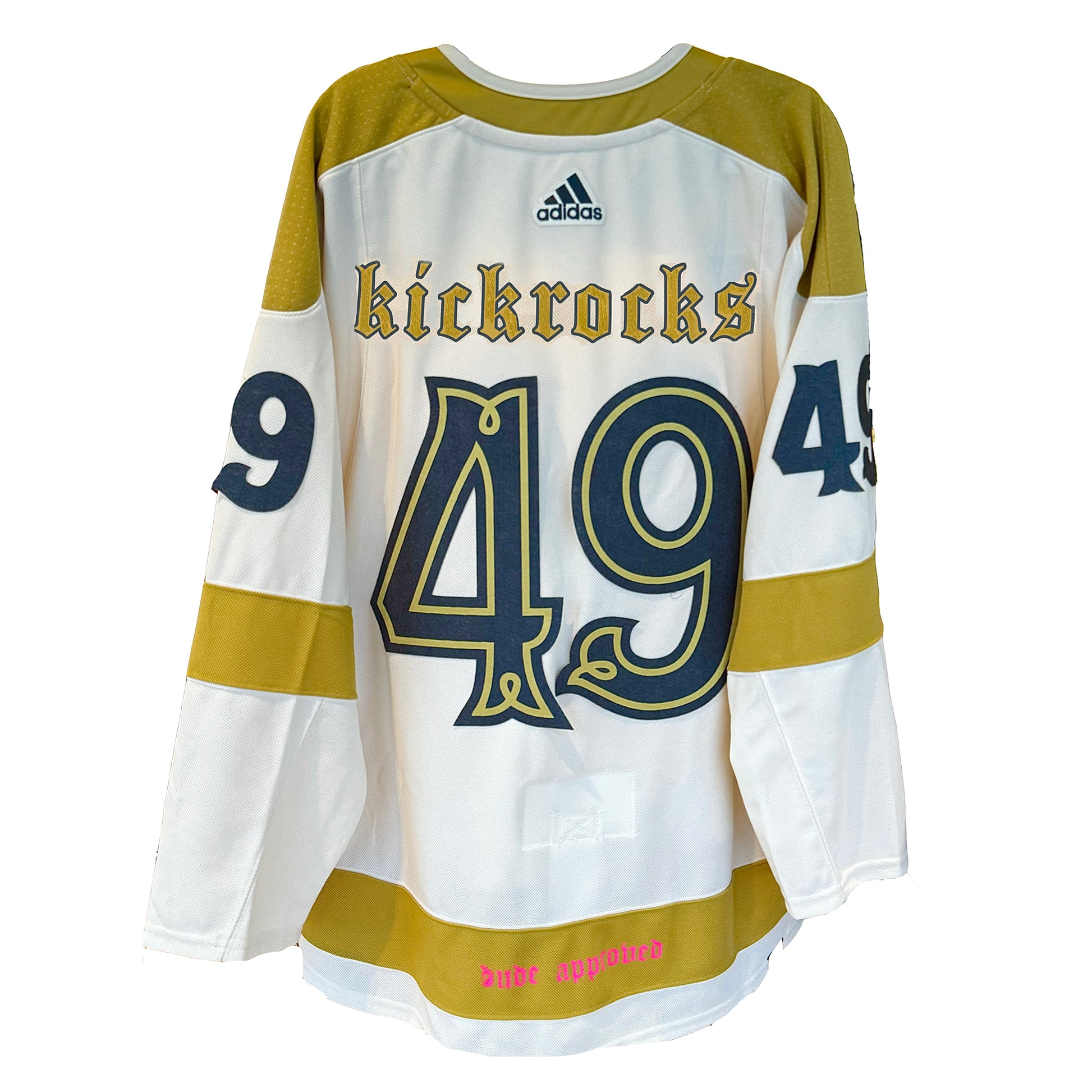 1/1 custom hockey jersey for the 49th song ‘kickrocks’ in the 100 Week Project. Each stitch and embellishment has been carefully handcrafted and chosen to reflect the fusion of the song and the Born Dude brand. 1/1 custom hockey card and glow-in-the-dark "dude" patch included.