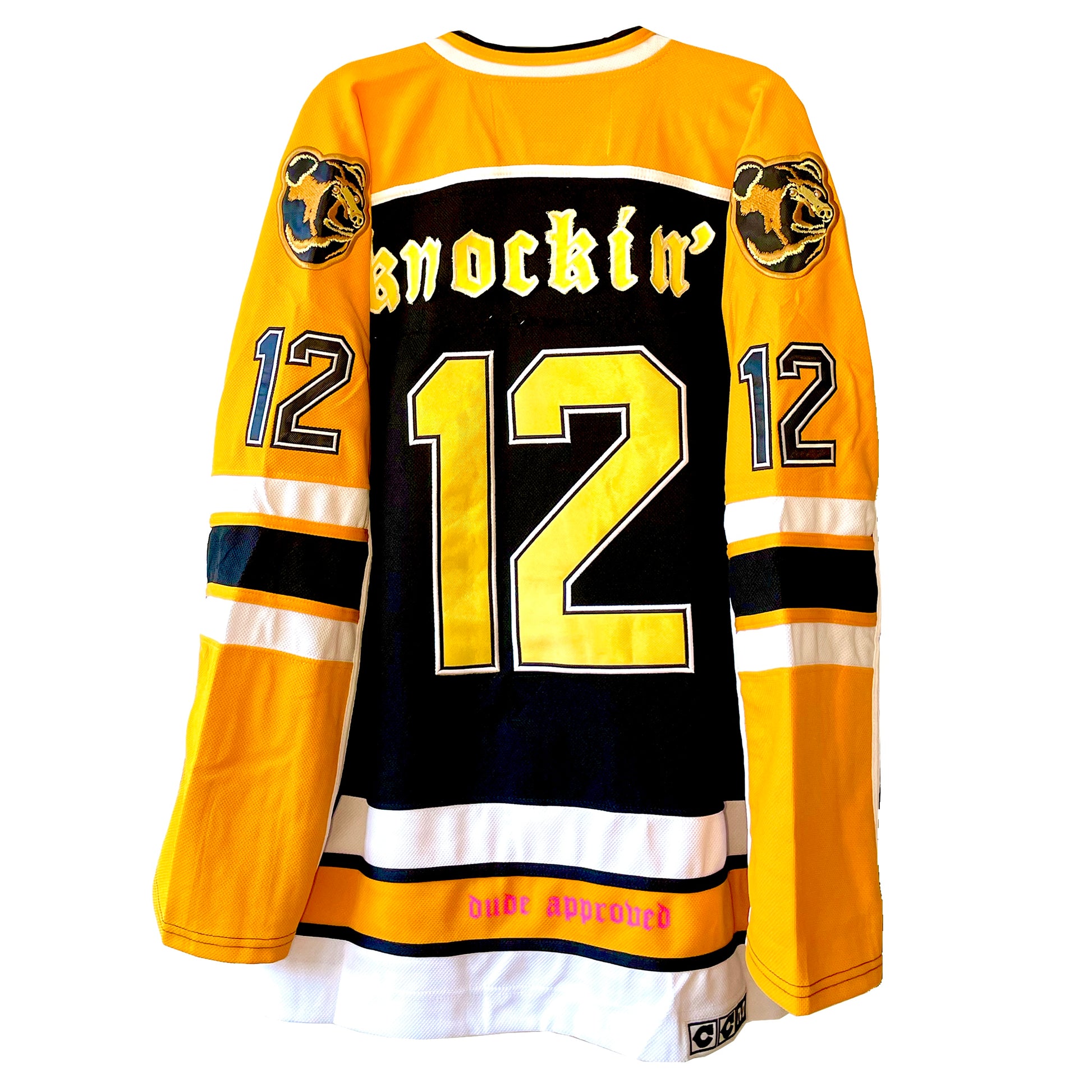 1/1 custom hockey jersey for the 12th song ‘knockin'’ in the 100 Week Project. Each stitch and embellishment has been carefully handcrafted and chosen to reflect the fusion of the song and the Born Dude brand. 1/1 custom hockey card and glow-in-the-dark "dude" patch included.