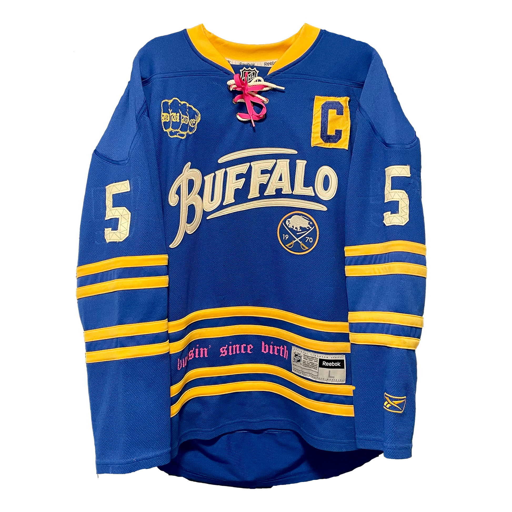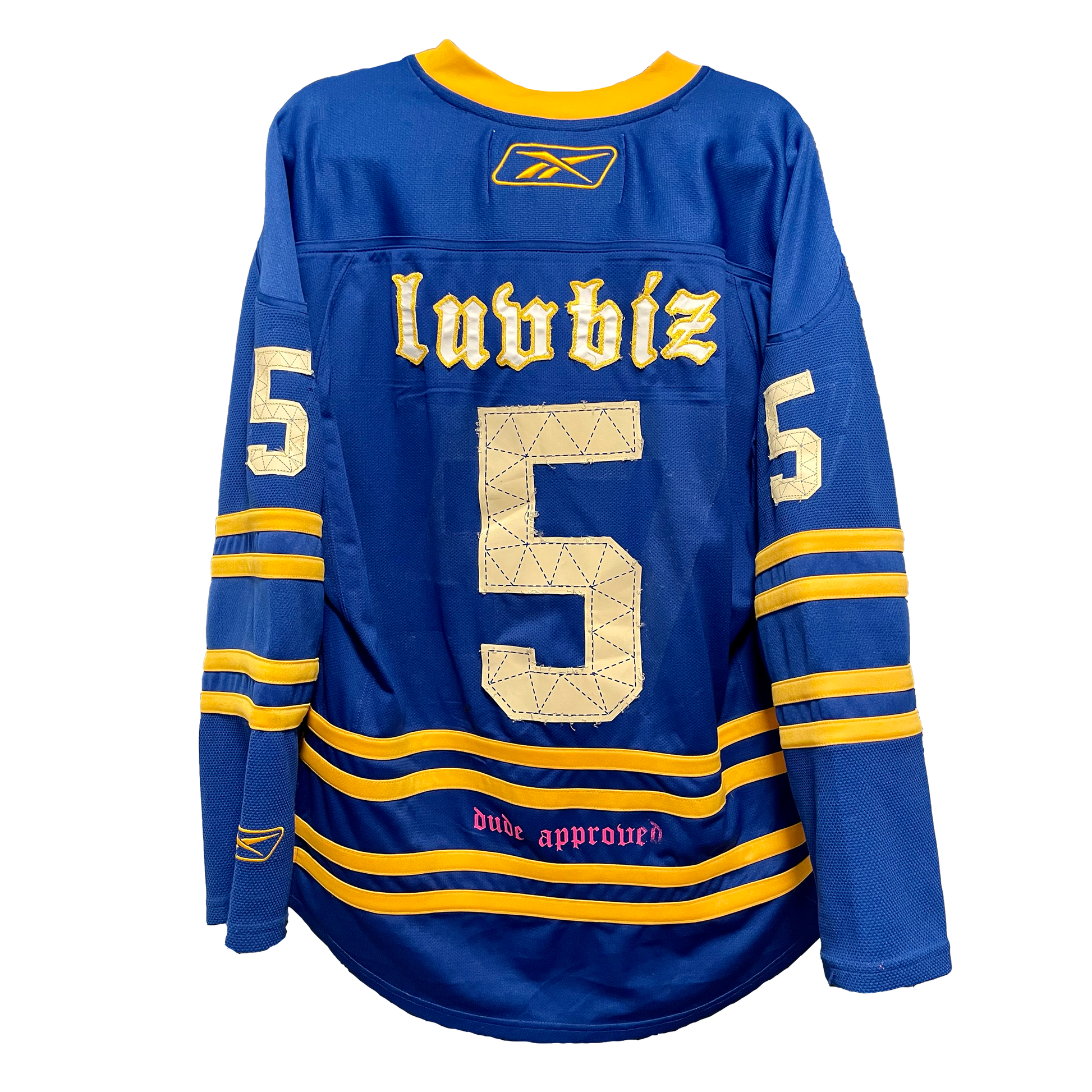1/1 custom hockey jersey for the 5th song ‘luvbiz’ in the 100 Week Project. Each stitch and embellishment has been carefully handcrafted and chosen to reflect the fusion of the song and the Born Dude brand. 1/1 custom hockey card and glow-in-the-dark "dude" patch included.