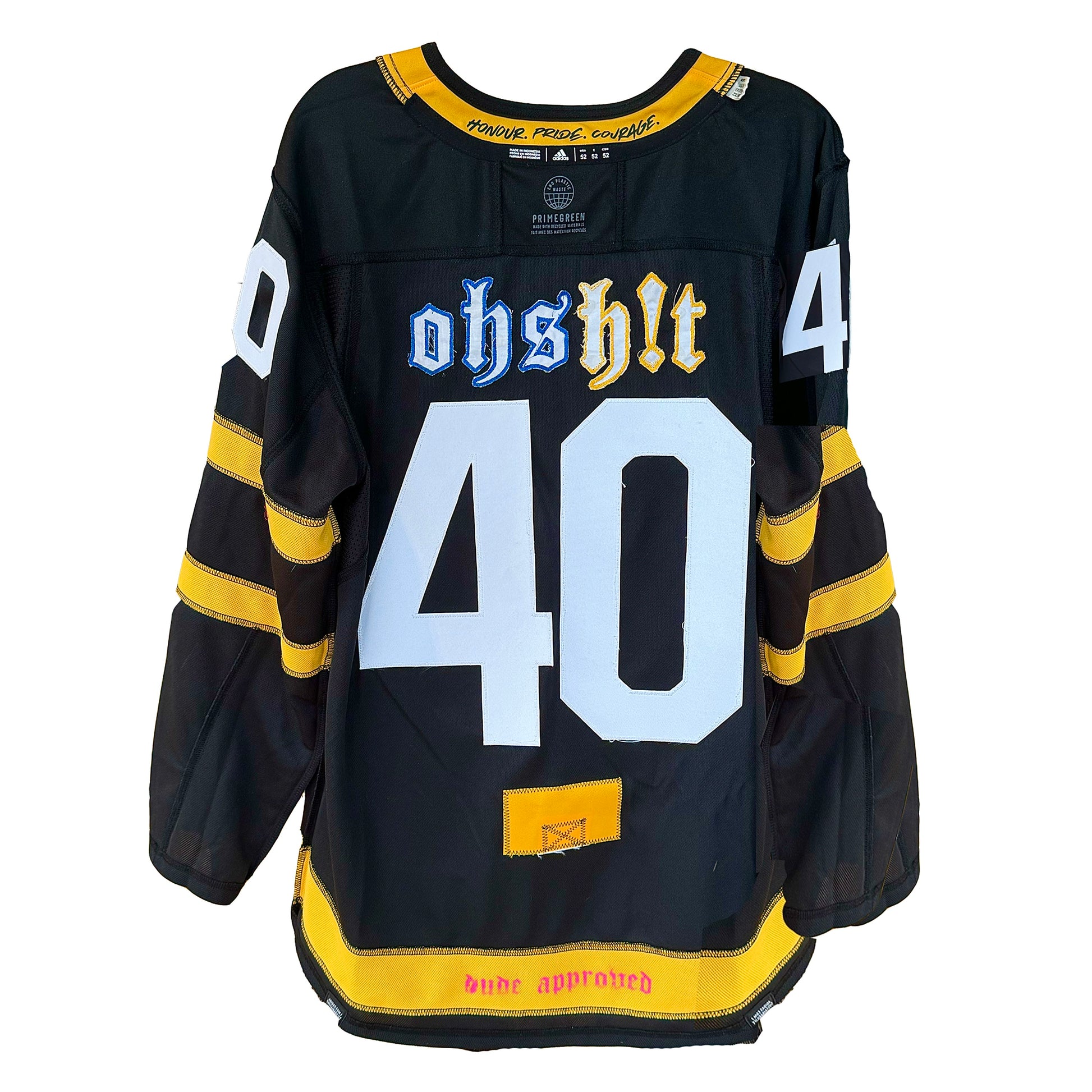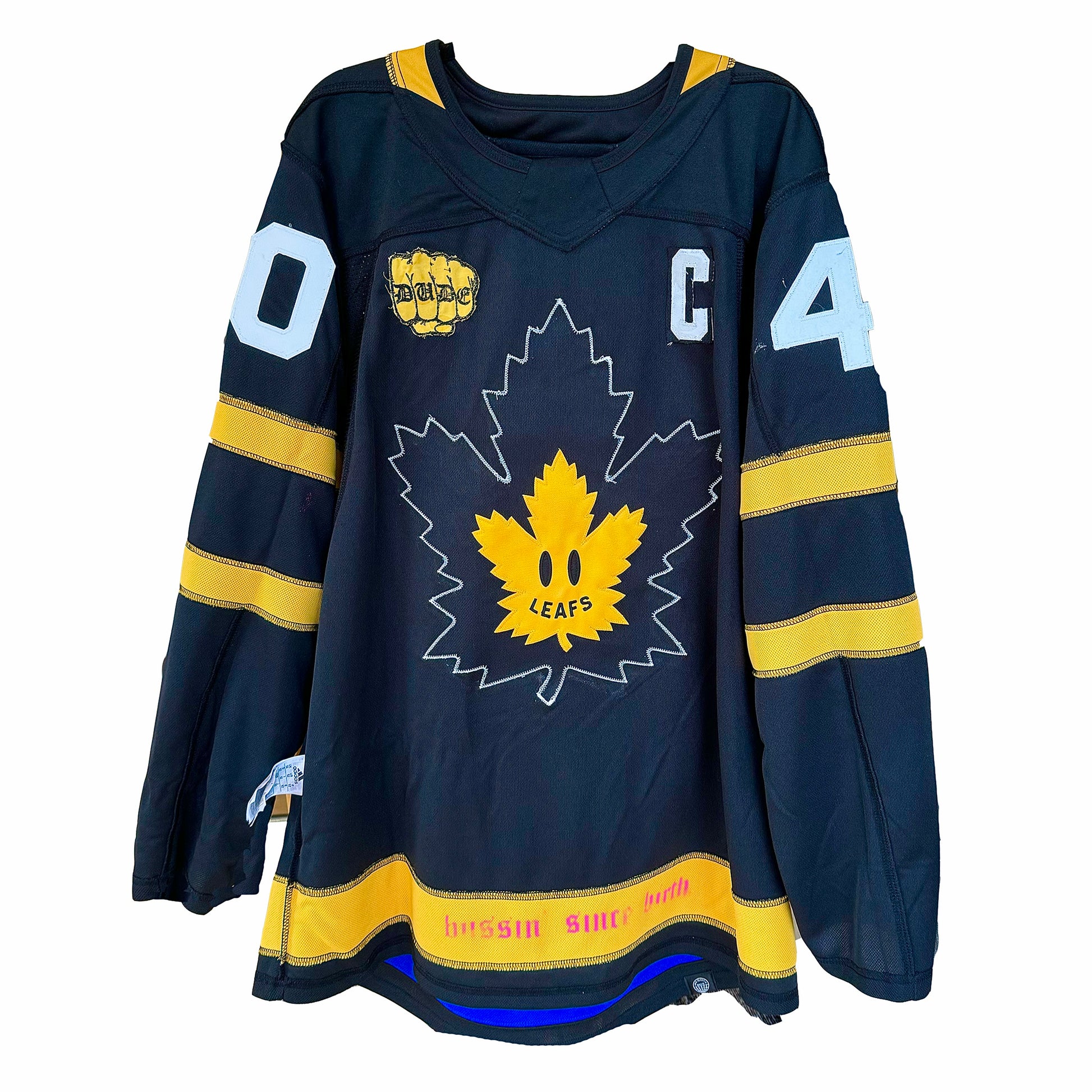 1/1 custom (reversible) hockey jersey for the 40th song ‘ohsh!t’ in the 100 Week Project. Each stitch and embellishment has been carefully handcrafted and chosen to reflect the fusion of the song and the Born Dude brand. 1/1 custom hockey card and glow-in-the-dark "dude" patch included.