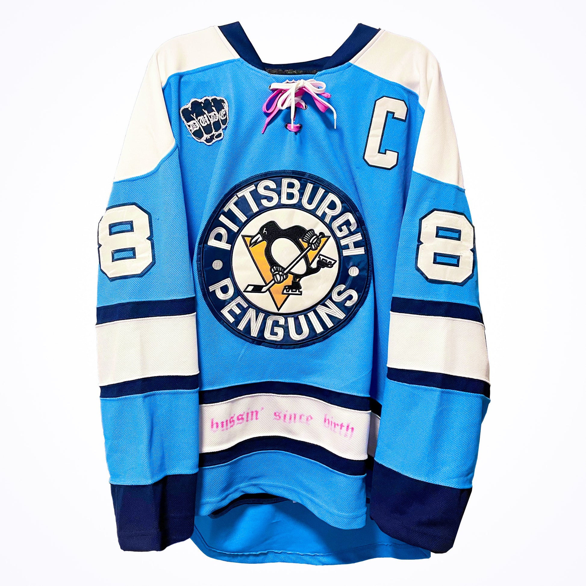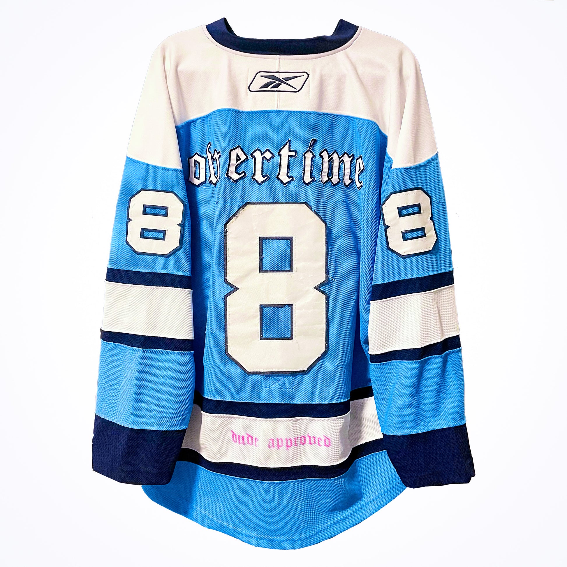1/1 custom hockey jersey for the 8th song ‘overtime’ in the 100 Week Project. Each stitch and embellishment has been carefully handcrafted and chosen to reflect the fusion of the song and the Born Dude brand. 1/1 custom hockey card and glow-in-the-dark "dude" patch included.