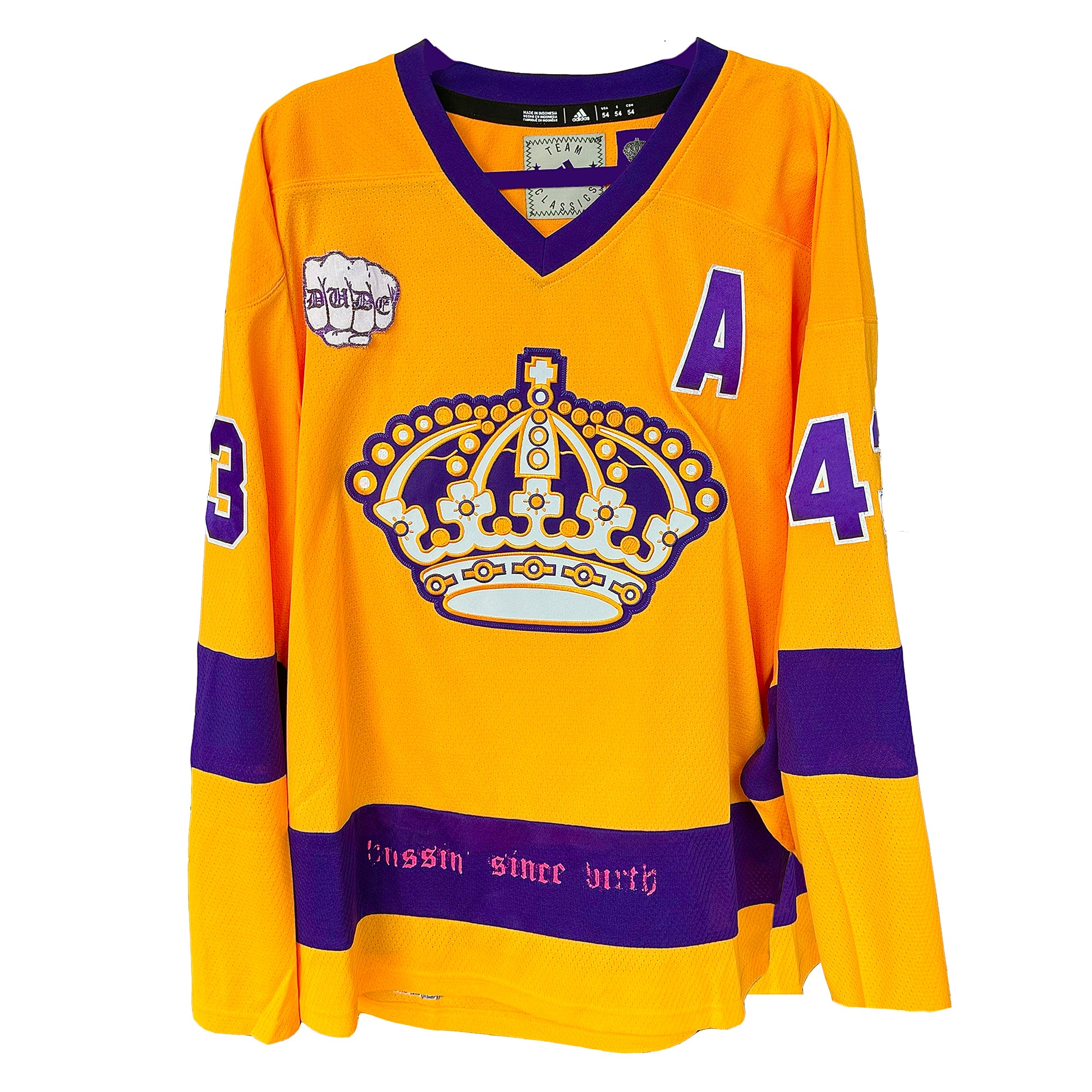 1/1 custom hockey jersey for the 43rd song ‘savingface’ in the 100 Week Project. Each stitch and embellishment has been carefully handcrafted and chosen to reflect the fusion of the song and the Born Dude brand. 1/1 custom hockey card and glow-in-the-dark "dude" patch included.