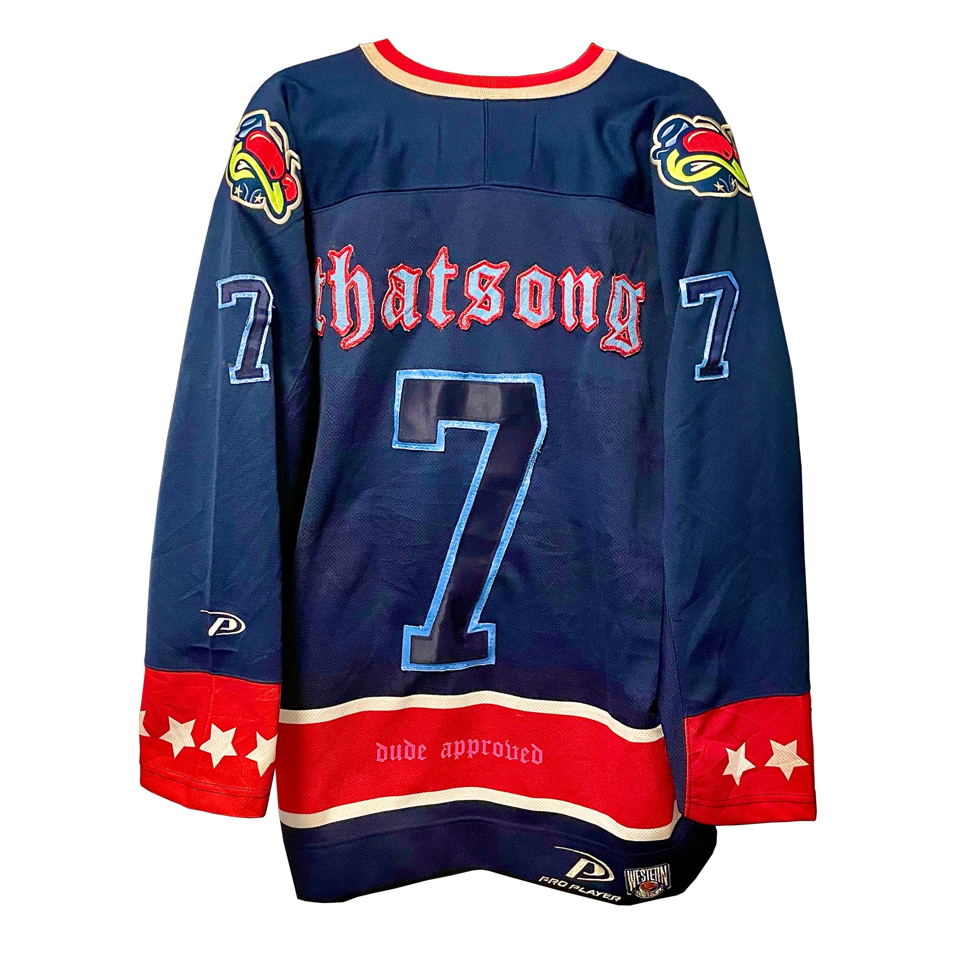 1/1 custom hockey jersey for the 7th song ‘thatsong’ in the 100 Week Project. Each stitch and embellishment has been carefully handcrafted and chosen to reflect the fusion of the song and the Born Dude brand. 1/1 custom hockey card and glow-in-the-dark "dude" patch included.