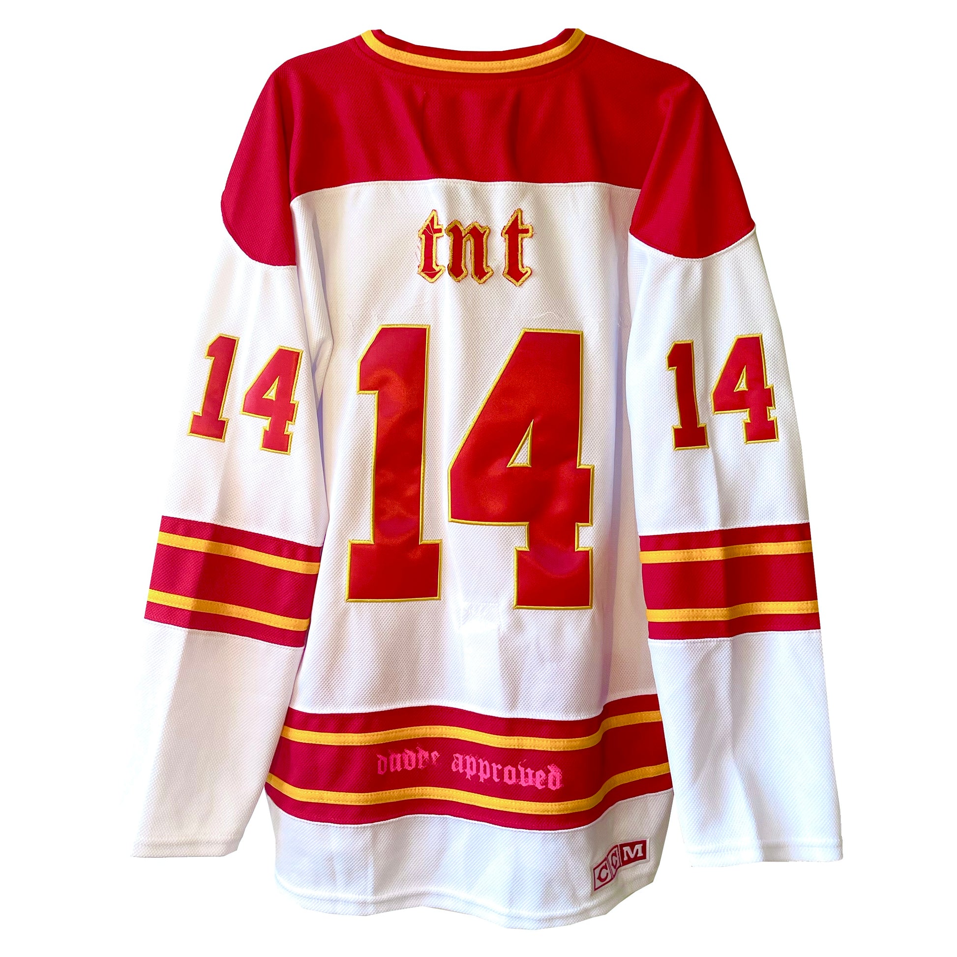 1/1 custom hockey jersey for the 10th song ‘tnt’ in the 100 Week Project. Each stitch and embellishment has been carefully handcrafted and chosen to reflect the fusion of the song and the Born Dude brand. 1/1 custom hockey card and glow-in-the-dark "dude" patch included.