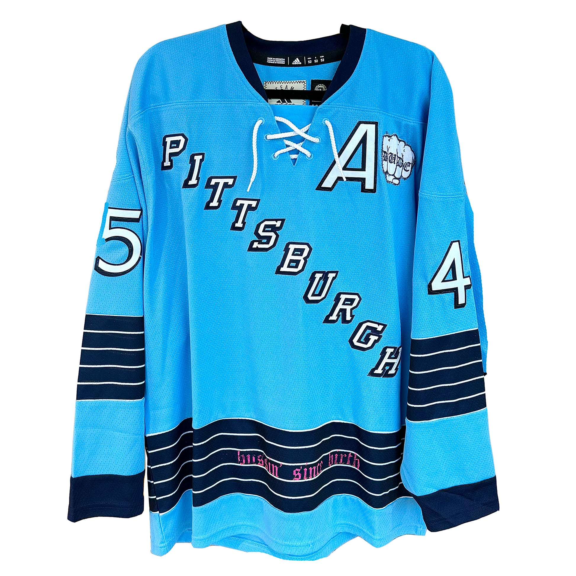 1/1 custom hockey jersey for the 45th song ‘waiting’ in the 100 Week Project. Each stitch and embellishment has been carefully handcrafted and chosen to reflect the fusion of the song and the Born Dude brand. 1/1 custom hockey card and glow-in-the-dark "dude" patch included.